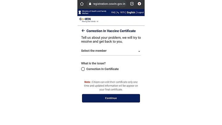 Select a family member whose certificate needs to be rectified. Click on Continue.