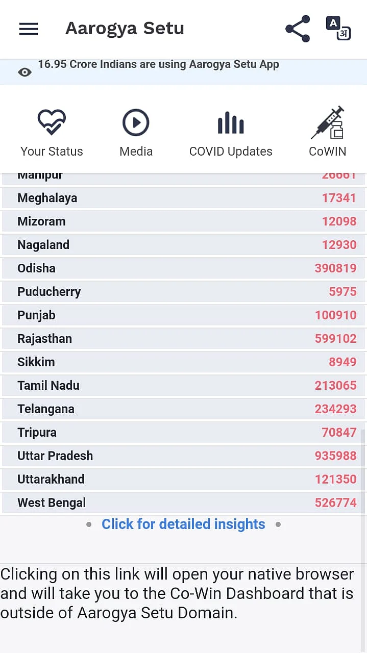 - You can now access information on the total number of people vaccinated state-wise. You can also get detailed information by clicking on ‘Click for Detailed Insights’ at the bottom of the page.