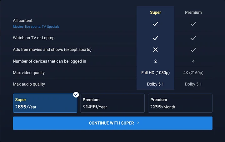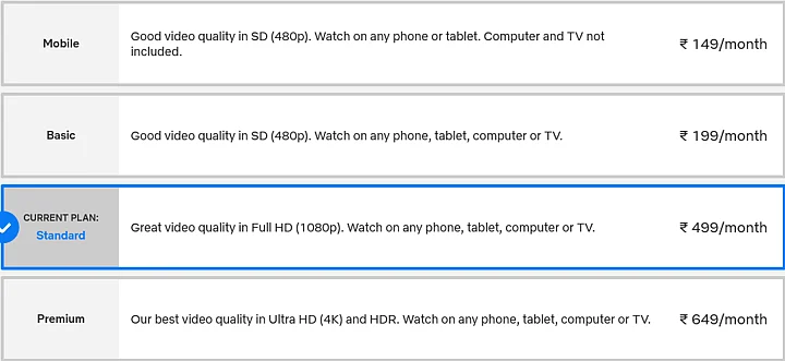 Even though its cheapest plan is Rs 149 per month, it only offers access to one user account, on only one mobile or tablet at 480p resolution. You don't get access to 4K even with Rs 499 a month.