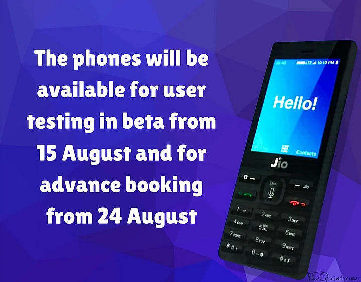 The JioPhone will be available for user testing in beta mode from 15 August and for pre-booking from 24 August.