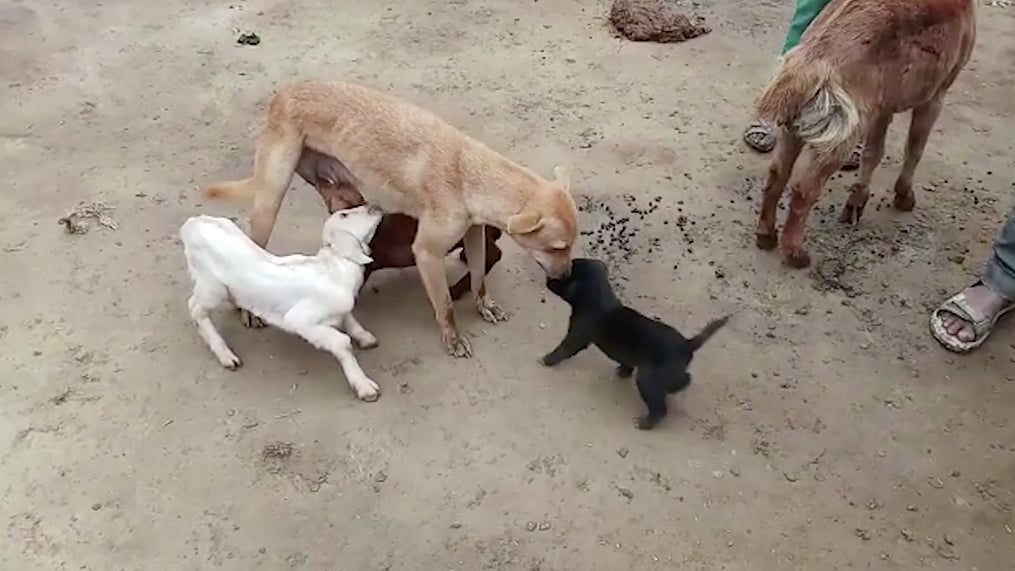 Bizarre Yet Adorable: Mother Dog Feeds Hungry Baby Goats