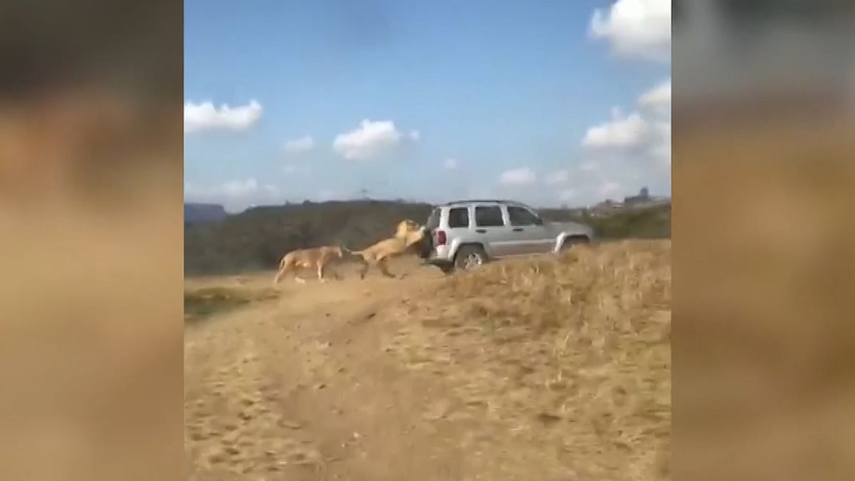 Three Lions Give SUV a Rough Ride at South African Wildlife Park