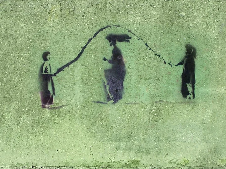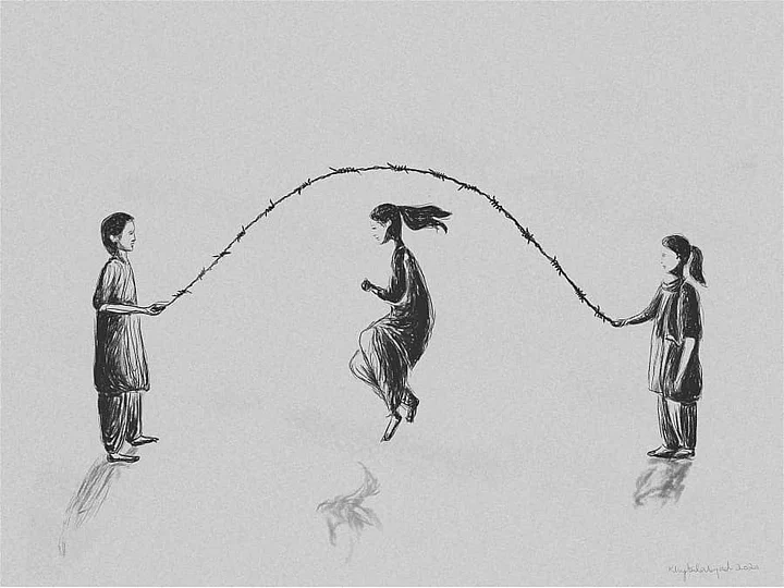 Her drawing of three girls playing jump rope made up of a barbed wire clearly shows the disturbing reality of Kashmir, as seen by Khytul while growing up.