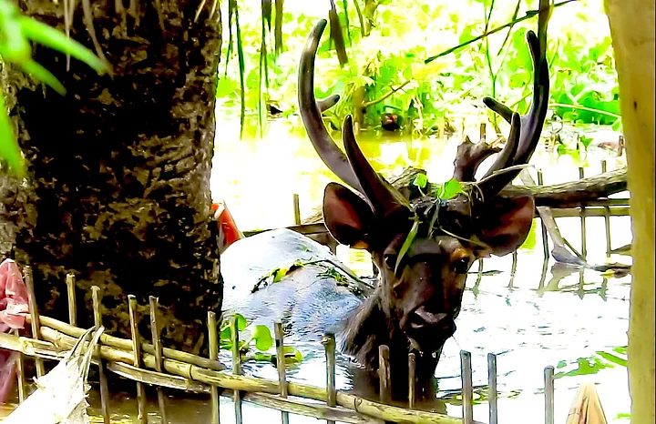 - 02/04A deer trying to escape flood waters(Photo: Twitter/ Kaziranga National Park & Tiger Reserve)