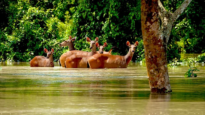 - 04/04A herd of deer trying to escape flood waters(Photo: Twitter/ Kaziranga National Park & Tiger Reserve)