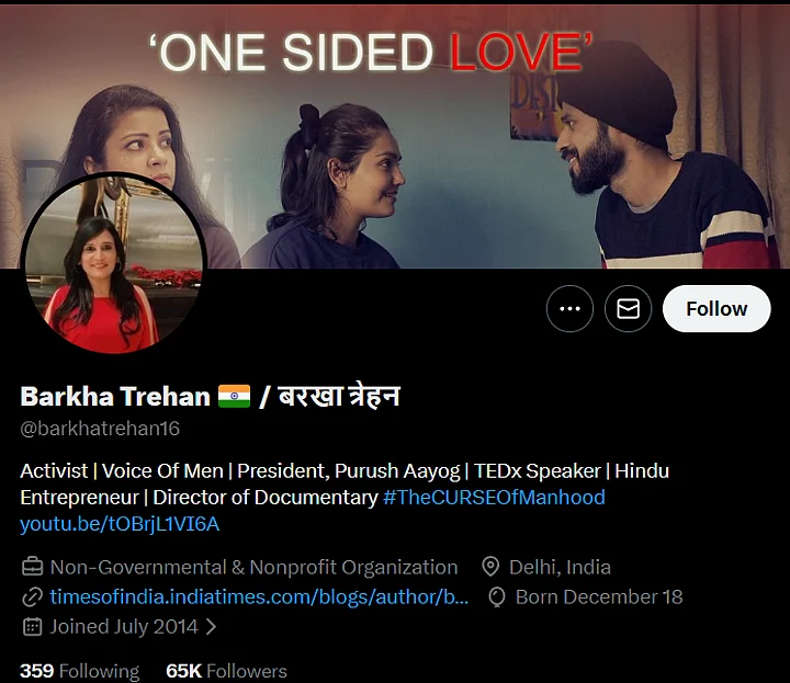 Barkha Trehan founded the Purush Aayog in 2019. The official pamphlet shows her photographs with Prime Minister Narendra Modi, Home Minister Amit Shah and Union Minister Nitin Gadkari.
