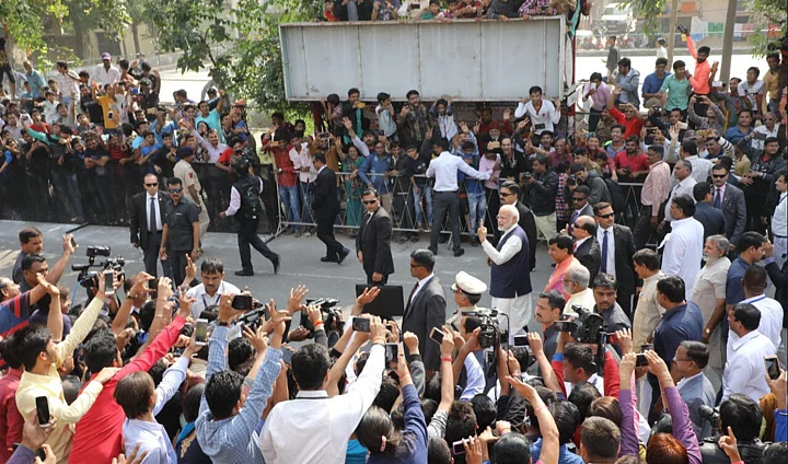 Prime Minister Narendra Modi cast his vote amid pomp and show in Sabarmati's Ranip locality on Thursday, 14 December.