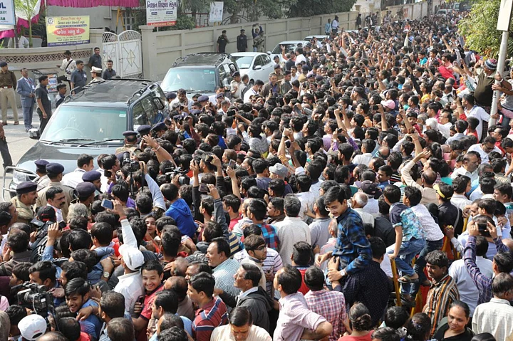Upon arriving in Ahmedabad, the PM was welcomed by a large crowd that cheered him on waving BJP flags.
