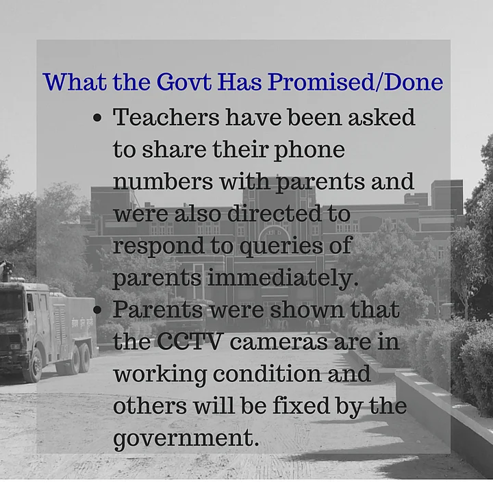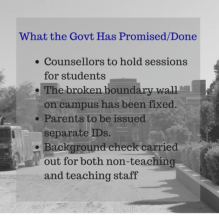 According to parents, they were also shown that the CCTV cameras that were already installed were in working condition, and informed that more cameras would be installed on the campus within a week. A broken wall, that allowed the entry from behind the school, has also reportedly been fixed. A makeshift toilet has been built inside the school premises for the non-teaching staff of the school.