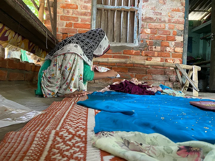 A few hundred metres away, 16-year-old Nargisa sits on the floor with a bright blue saree stretched in front of her. Her needle, sequence packets, and glue are strewn across the almost-ready saree.