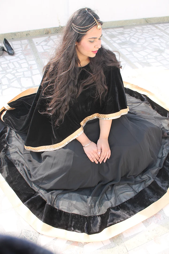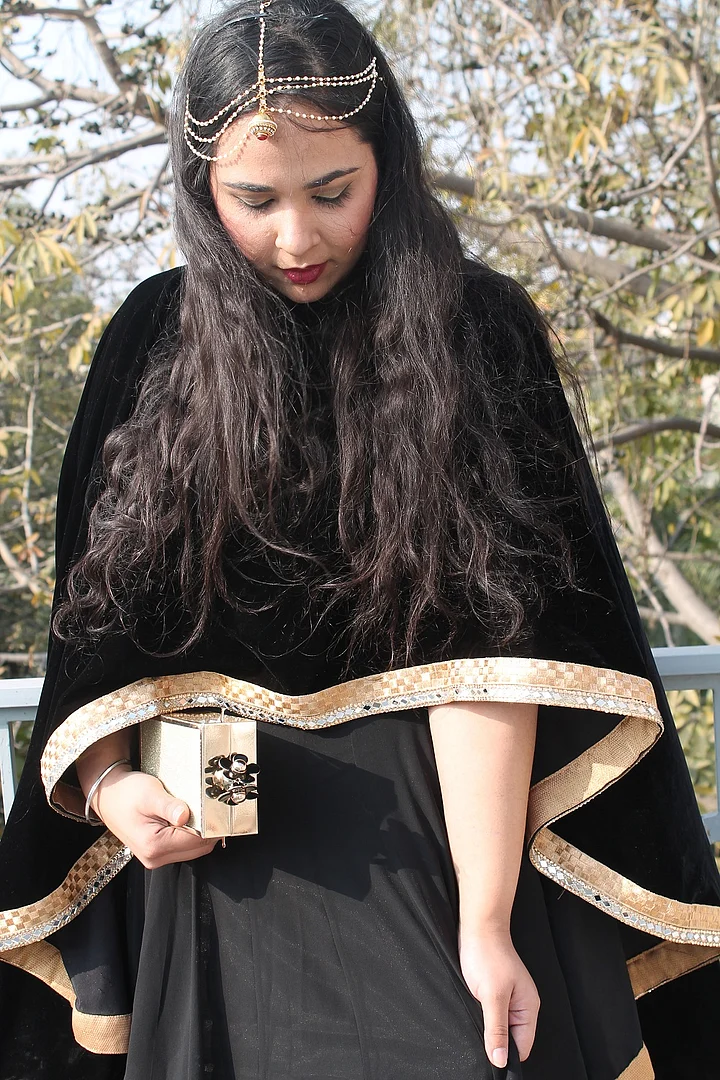 When talking about clothing for the plus-size Indian woman, an ethnic look that we can carry for parties and family occasions has to be discussed. Here, I paired a conventional black A-line georgette gown with a black velvet cape with an uneven hemline and complementing golden borders. I also added attention-seeking golden head gear just to jazz up the look.