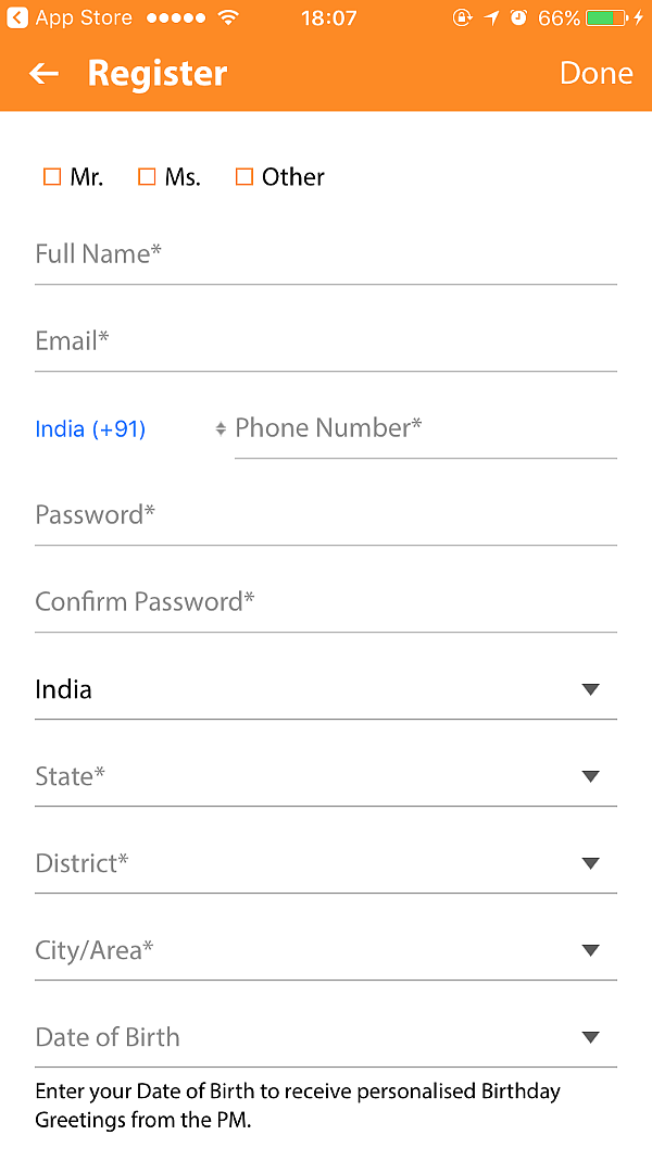 You will also have to compulsorily provide your phone number, district, city, DoB, profession and interests. The app also asks for your Voter ID. (That question, mind you, is optional – but the placement does not make it obvious.)