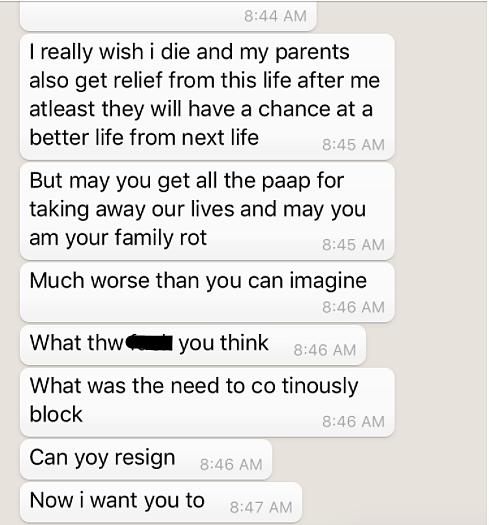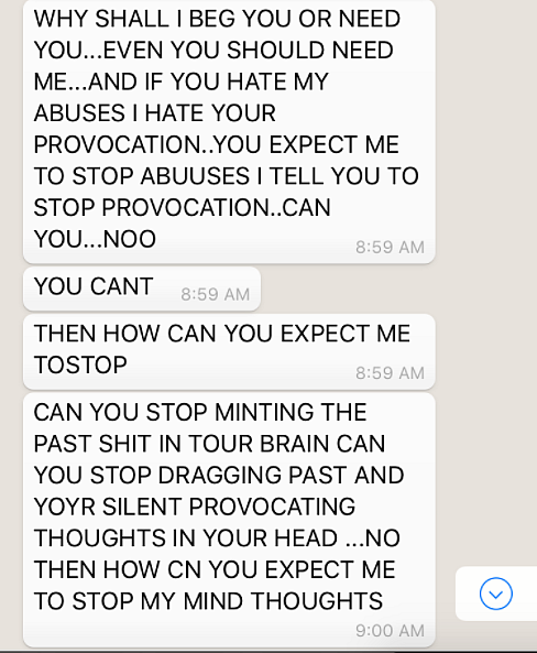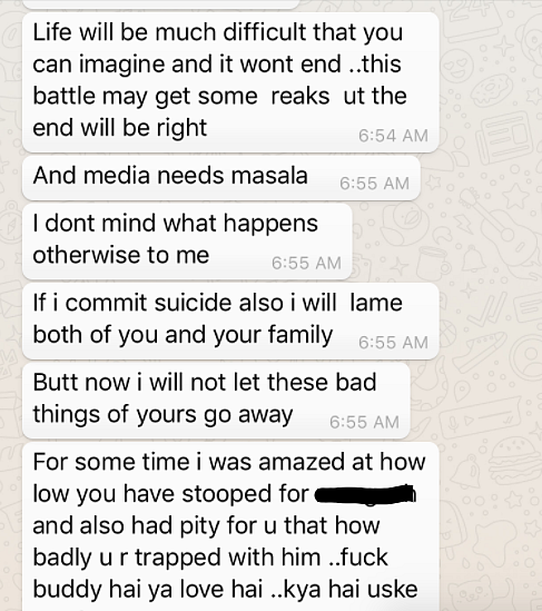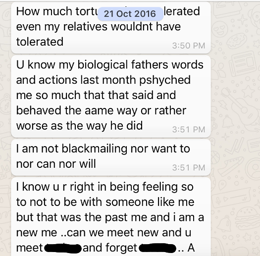 “Since then, nothing has happened. I went to the police station for an update but they simply told me that these things take time since he’s not in Mumbai. They say logistics and approvals have to fall in place. I insisted that they inform Varun that an FIR has been filed against him in the hopes he stops harassing me, but they said he might flee. They even asked me to not talk about the FIR. He’s still sending me messages and audio notes from different numbers everyday.”
