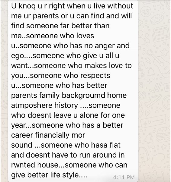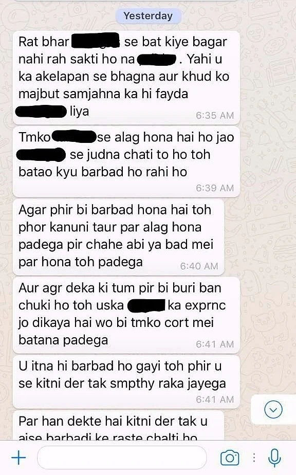 A few days later, Anamika woke up to messages from Varun with details on her daily movements; when she was where, and with whom. He had also been keeping tabs on Anamika’s friend who he thought was her boyfriend.