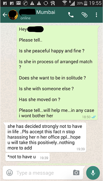 Desperate to regain direct access to Anamika, Varun crossed another line. He found out where she worked, called the office number on a Saturday, and abused the guard who told him that no one was there during the weekend. “It didn’t end there. He then called my HR head, CEO and another colleague. One day, I got a call from my HR Head asking me if I was fine. Turns out, she and my CEO had received several phone calls from Varun claiming that all my degrees and recommendations were fabricated; that I was a fraud.”