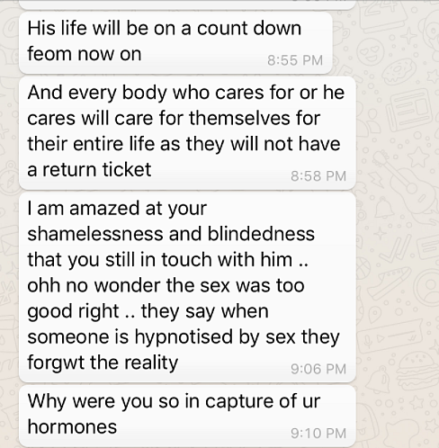 It has now been more than six years since they met. Varun continues to track around Mumbai – who she talks to, when she goes out, and with whom. He sends her a barrage of audio and text messages almost every night, while calling her parents, aunts, cousin, friends, her uncle in Indonesia(!) to spread rumours about her promiscuity, her indecent lifestyle and her alleged married status.